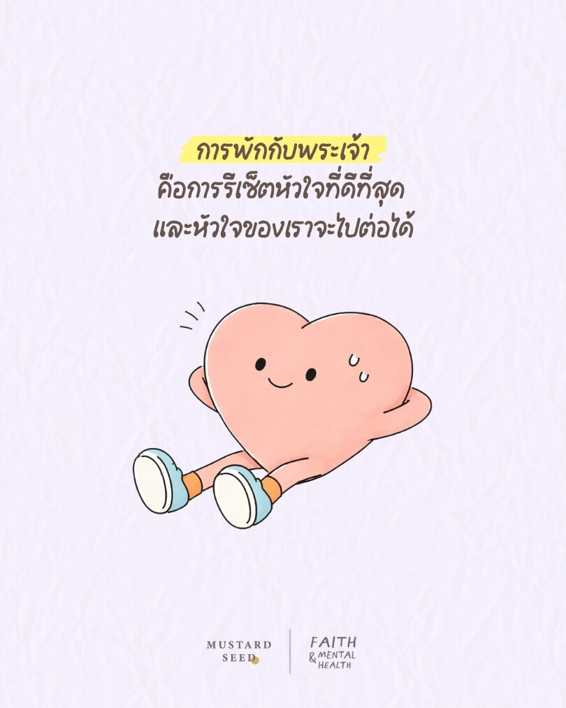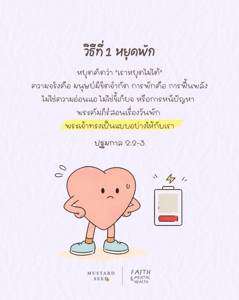 เดอะแบกบางคนคิดว่า “เราหยุดไม่ได้” แต่เราต้องยอมรับว่า “มนุษย์มีขีดจำกัด” อพยพ 20:8 เรียนรู้ที่จะพัก เพราะการพักคือ การฟื้นพลังไม่ใช่ความอ่อนแอ ไม่ใช่ขี้เกียจหรือการหนีปัญหา พระคัมภีร์สอนเรื่องวันพัก พระเจ้าทรงเป็นแบบอย่างให้กับเรา การพักไม่ใช่เรื่องผิดแต่เป็นส่วนหนึ่งของชีวิตที่พระเจ้าตั้งไว้ ปฐมกาล 2:2-3 “เมื่อวันที่เจ็ด พระเจ้าทรงเสร็จสิ้นพระราชกิจ… และทรงหยุดพัก… และทรงอวยพรวันที่เจ็ด” พระเจ้าทรงกำหนดวันพักเพื่อให้เราฟื้นฟูร่างกายและจิตใจ