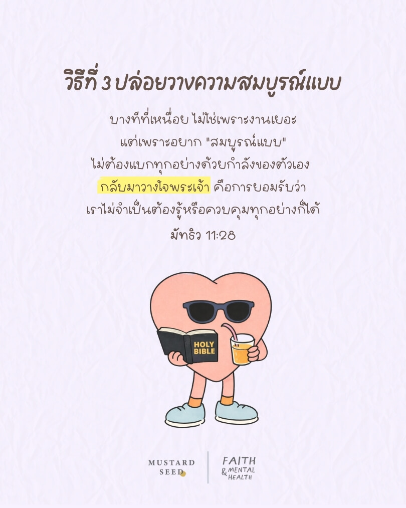 หลายครั้งที่เราเหนื่อย ไม่ใช่เพราะงานเยอะอย่างเดียว แต่เพราะเราอยากทำทุกอย่างให้ “สมบูรณ์แบบ” เราคิดว่าต้องทำให้ดีที่สุด ต้องไม่พลาด ต้องควบคุมทุกอย่างให้ได้ เรากำลังติดกับดักความสมบูรณ์แบบ แต่ในความเป็นจริงคือ ความสมบูรณ์แบบกำลังทำให้เราหนักเกินไป มัทธิว 11:28 “บรรดาผู้เหน็ดเหนื่อยและแบกภาระหนักจงมาหาเรา และเราจะให้ท่านทั้งหลายได้หยุดพัก” คุณไม่ต้องแบกทุกอย่างด้วยกำลังของตัวเอง กลับมาวางใจพระเจ้าคือการยอมรับว่า เราไม่จำเป็นต้องรู้หรือควบคุมทุกอย่างก็ได้