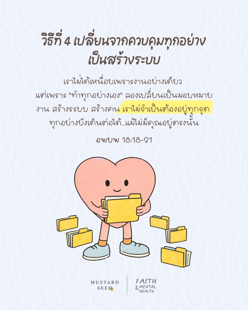 หลายคนที่เป็นผู้นำหรือเป็นเดอะแบก มักเหนื่อยไม่ใช่เพราะงานเยอะอย่างเดียว แต่เพราะพยายามควบคุมทุกอย่างด้วยตัวเอง อยากให้งานออกมาดีเลยลงมือทำเองทุกอย่าง อยากให้ไม่มีข้อผิดพลาดเลยไม่กล้าปล่อยให้คนอื่นทำ สุดท้ายงานอาจดีขึ้น แต่หัวใจกลับเหนื่อยหมดแรง พระเจ้าทรงเป็นพระเจ้าแห่งระเบียบไม่ใช่ความวุ่นวาย หลายครั้งเราไม่มอบหมายไม่ใช่เพราะไม่มีคนช่วย แต่เพราะไม่ไว้ใจหรือกลัวงานไม่ดีการมอบหมายคือทักษะที่ต้องฝึก ในอพยพ 18:18-21 ตอนที่โมเสสพยายามตัดสินทุกเรื่องด้วยตัวเอง จนกระทั่งเยโธรแนะนำว่าให้สร้างระบบผู้นำที่ดีคือคนที่สร้างคน สร้างระบบ ไม่ใช่ทำงานแทนทุกคนไม่ได้ถูกสร้างมาเพื่อทำทุกอย่างเอง ทุกอย่างยังเดินต่อได้…แม้ไม่มีคุณอยู่ตรงนั้น