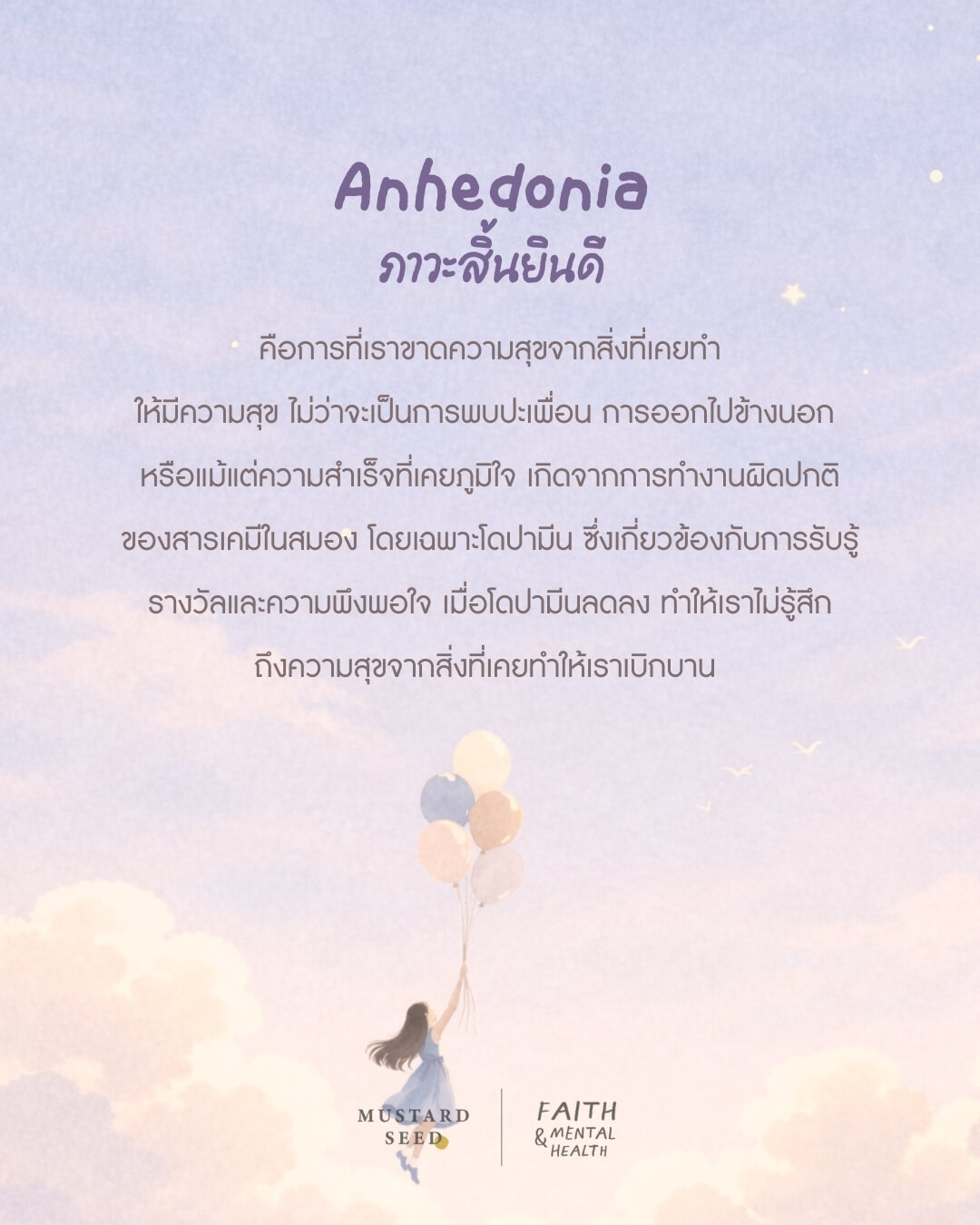 Anhedonia หรือภาวะสิ้นยินดี เป็นอาการที่สำคัญของภาวะซึมเศร้า (Major Depressive Disorder) ซึ่งเกิดจากการทำงานผิดปกติของสารเคมีในสมอง โดยเฉพาะอย่างยิ่งสารสื่อประสาทโดปามีน (dopamine) ซึ่งเกี่ยวข้องกับการรับรู้รางวัลและความพึงพอใจ การลดลงของการผลิตโดปามีนทำให้เราไม่สามารถรับรู้หรือรู้สึกถึงความสุขจากสิ่งที่เคยทำให้มีความสุข เช่น การรับประทานอาหารที่ชอบ การออกกำลังกาย หรือการใช้เวลาร่วมกับคนที่รัก รู้สึกเหงา ท้อแท้ หรือขาดแรงจูงใจในการใช้ชีวิตประจำวัน ภาวะนี้เกิดได้จากความเครียดที่สะสม หรือการประสบกับเหตุการณ์ที่ทำให้รู้สึกผิดหวังหรือเสียใจอย่างลึกซึ้ง ความโดดเดี่ยวทางสังคม หรือการขาดการสนับสนุนจากครอบครัวและเพื่อนฝูงก็อาจทำให้เกิดอาการนี้ได้