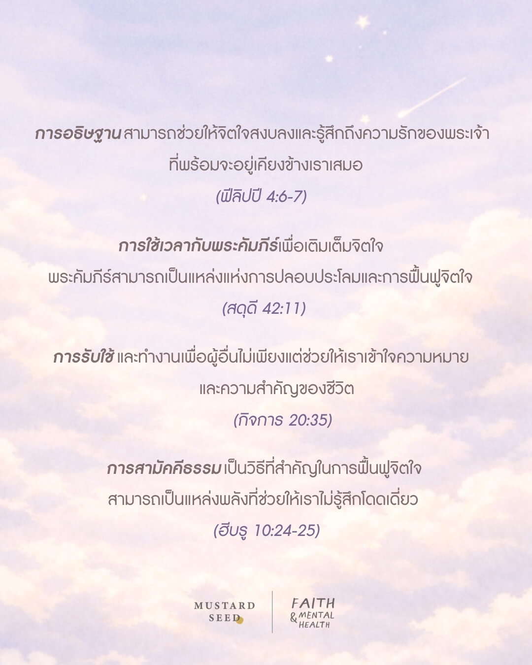 ในพระคัมภีร์มีหลายตอนที่กล่าวถึงการฟื้นฟูจิตใจและการเผชิญหน้ากับความทุกข์ยากในชีวิต การสูญเสียความสุขหรือความหวัง เริ่มจากการกลับมาหาพระเจ้าและพึ่งพาความรักของพระองค์ ในยามที่รู้สึกเหนื่อยหน่ายและท้อแท้ พระองค์สัญญาว่าจะให้การพักผ่อนและความสงบกับจิตใจผู้ที่หันมาหาและพึ่งพาพระองค์ (มัทธิว 11:28-30)