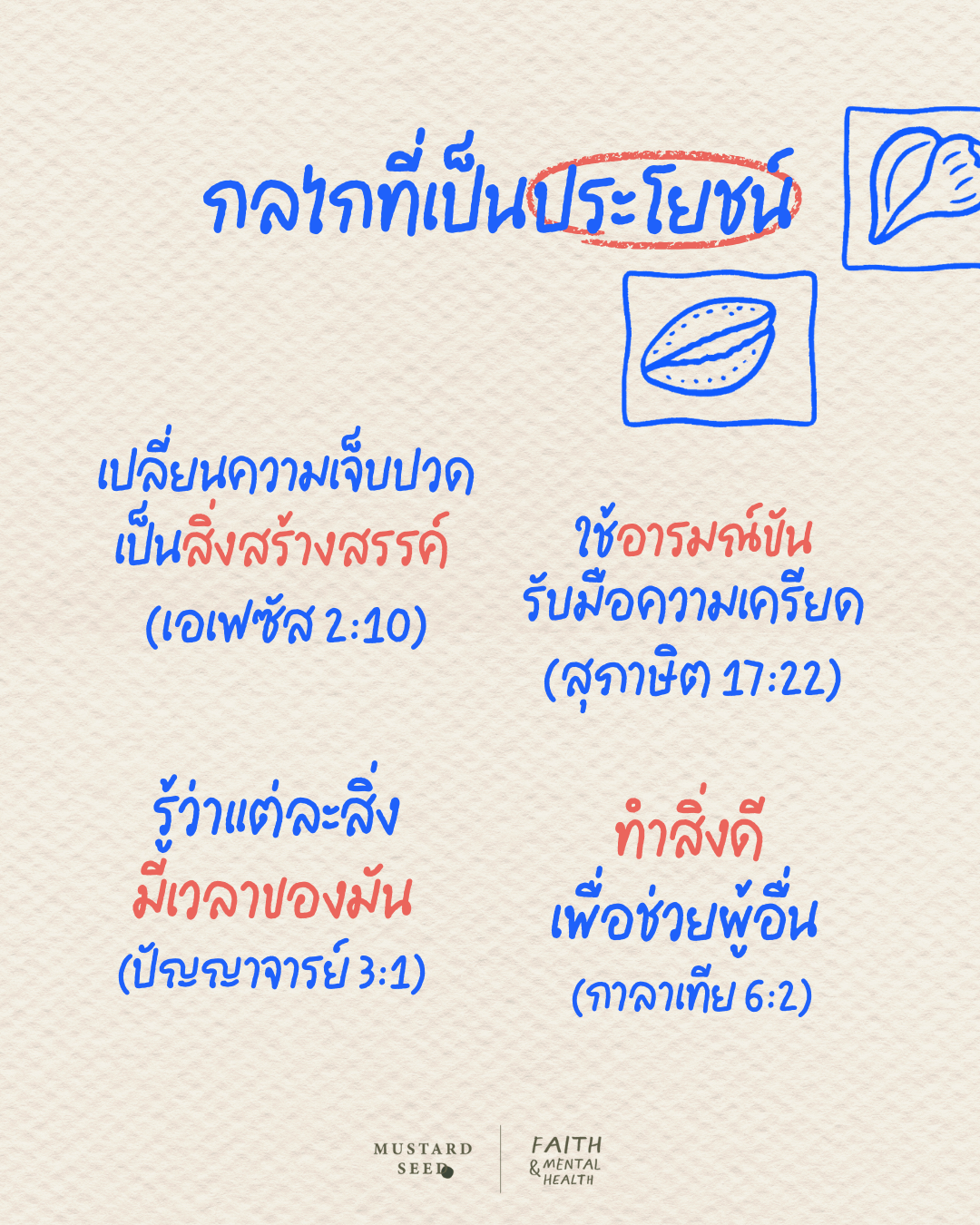 เลือก “เก็บ” ความรู้สึกไว้ก่อน แต่ไม่ลืม (Suppression)มีฤดูกาลสำหรับทุกสิ่ง และมีวาระสำหรับเรื่องราวทุกอย่างภายใต้ฟ้าสวรรค์ปัญญาจารย์ 3:1 เช่น ยังไม่ร้องไห้ตอนประชุม แต่จะร้องทีหลัง