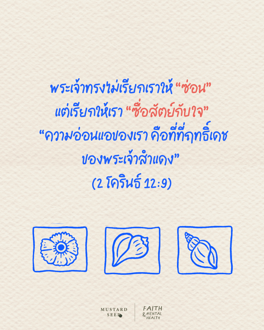 การรู้เท่าทันและยอมรับอารมณ์เป็นจุดเริ่มต้นของการรักษา  “การหนีจากความรู้สึกไม่ใช่คำตอบ และ พระเจ้าทรงเปิดทางให้เราซื่อสัตย์ต่อความรู้สึกของตนเองได้ พระคัมภีร์ไม่เคยบอกให้เราแข็งแกร่งตลอดเวลาแต่บอกว่าความอ่อนแอของเรา คือที่ที่ฤทธิ์เดชของพระเจ้าทำงาน(2 โครินธ์ 12:9)  พระเจ้าทรงรับฟัง พระเจ้าทรงช่วยให้เรารับผิดชอบใจตนเอง พระเจ้าทรงรักเราในแบบที่เราเป็น พระเจ้าไม่ละสายตาจากเรา